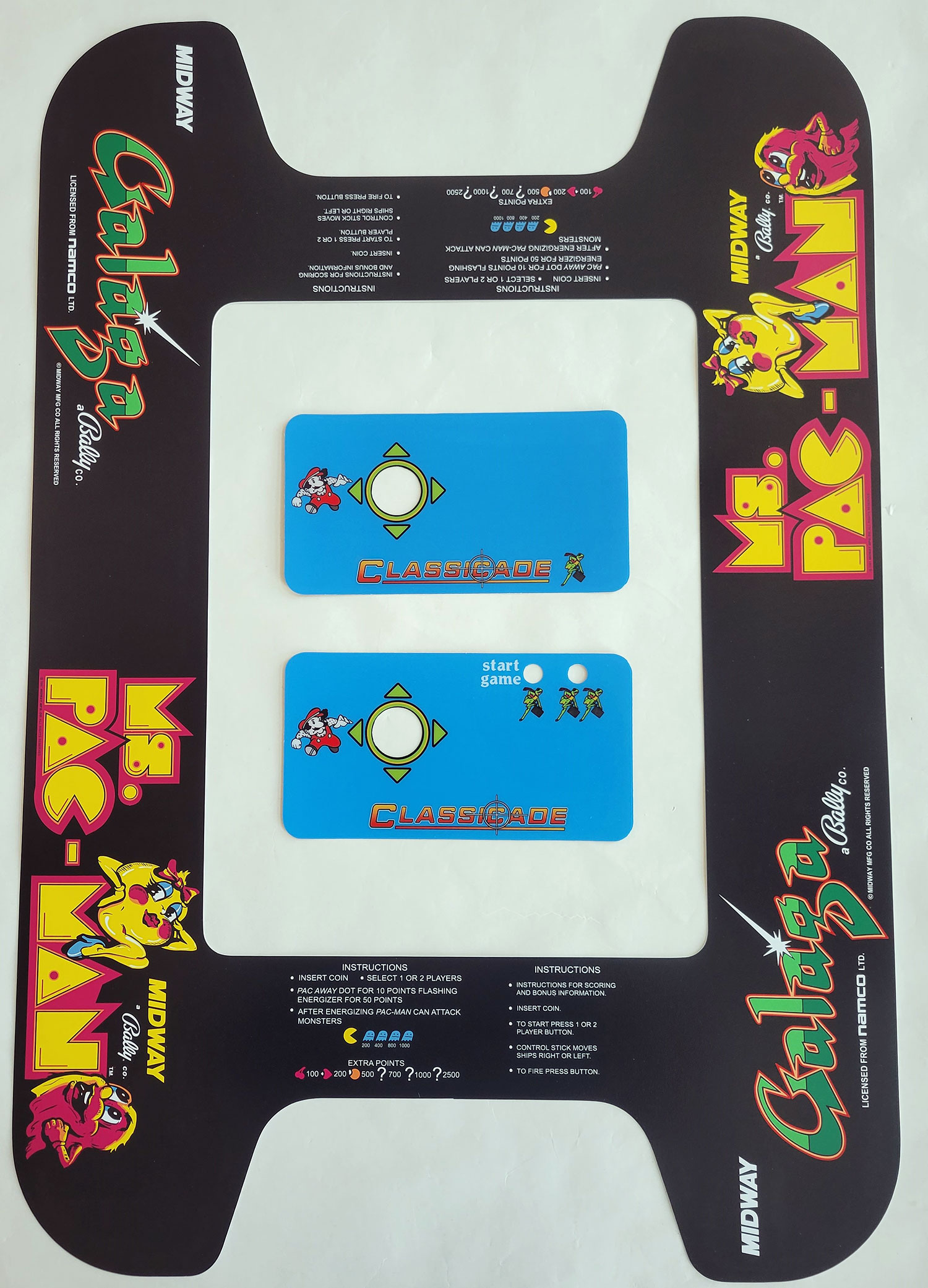 Package includes MsPac/Galaga Cocktail Underlay digital printed precut polystyrene, 33% thicker than our competition, measuring 21 3/4" x 31 3/4". Also included is the Multigame Classicade Cocktail CPO Set screen printed precut lexan measuring 8 7/8" x 4 3/4".